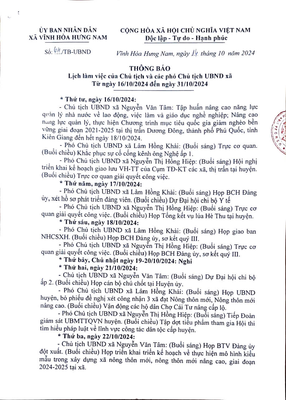 Lịch làm việc của Thường trực UBND xã Vĩnh Hòa Hưng Nam từ ngày 16 đến ngày 31 tháng 10 năm 2024: