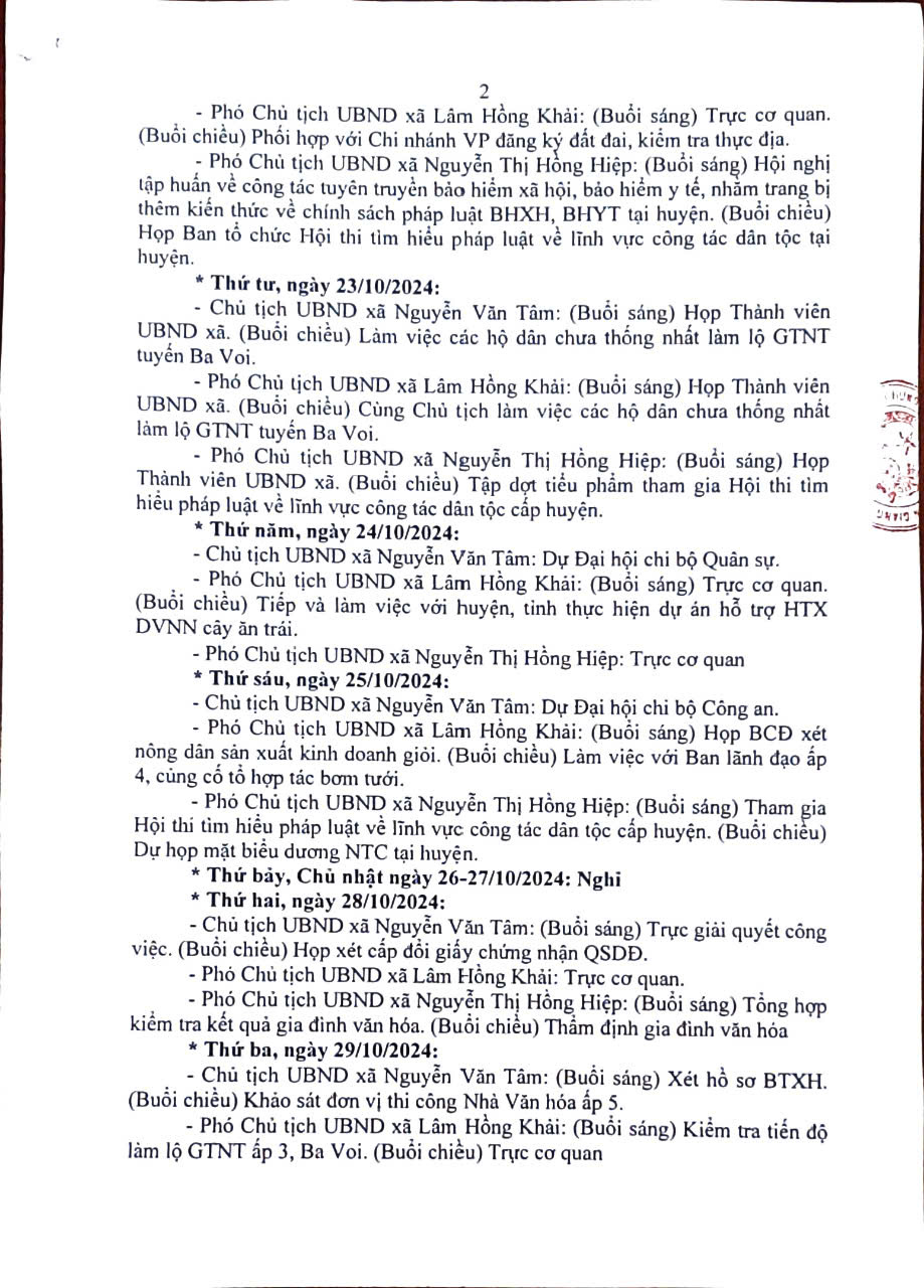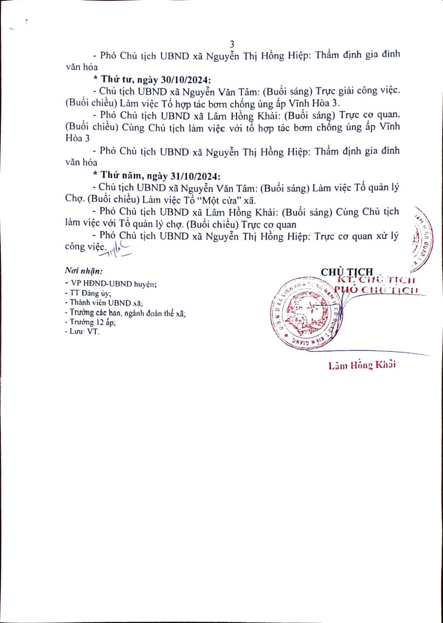 Lịch làm việc của Thường trực UBND xã Vĩnh Hòa Hưng Nam nữa cuối tháng 10 năm 2024