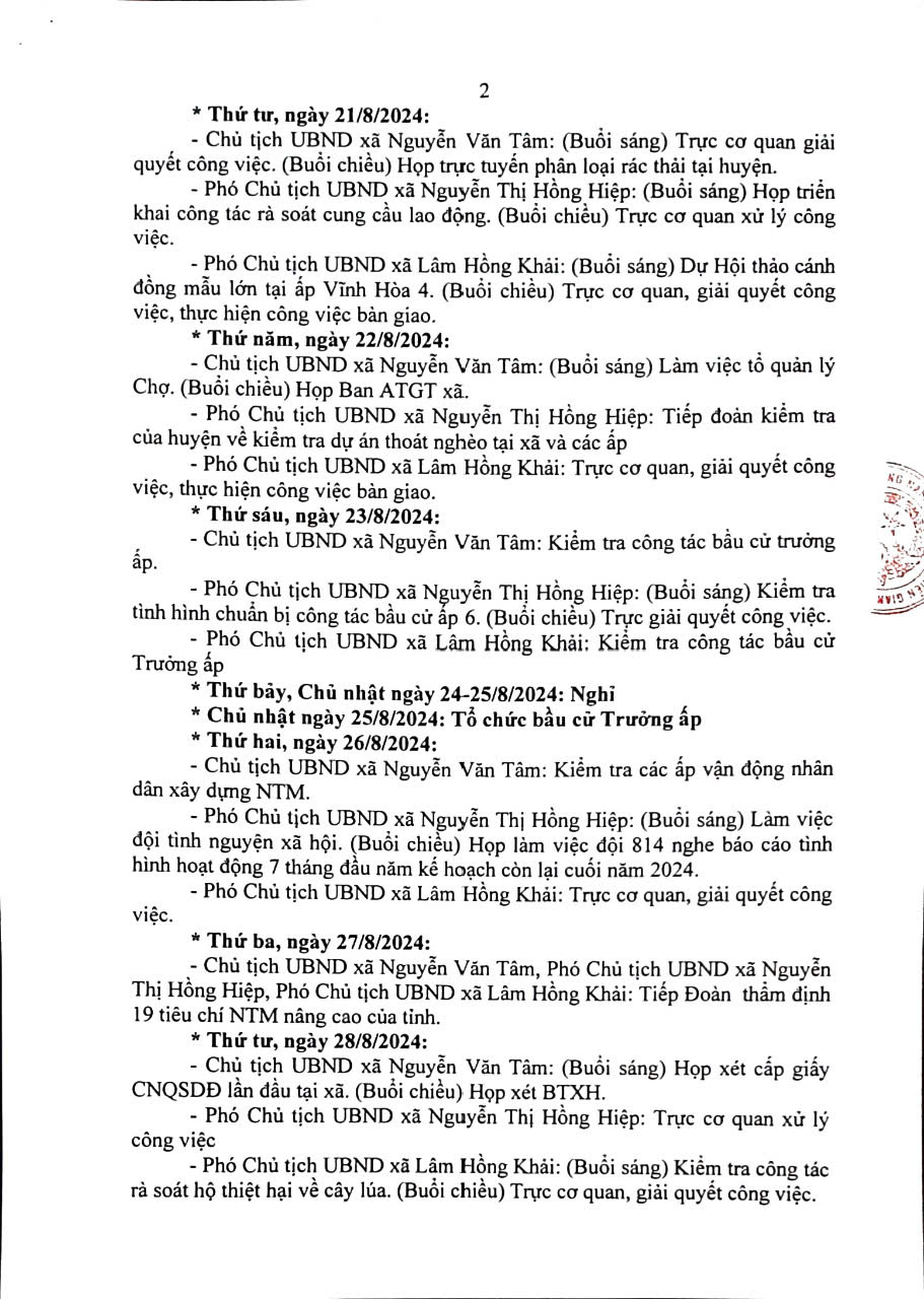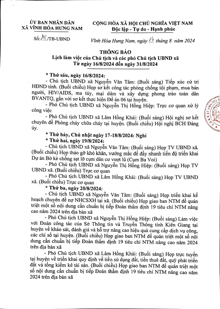 Lịch làm việc của Thường trực UBND xã Vĩnh Hòa Hưng Nam từ ngày 16 đến ngày 31 tháng 8 năm 2024