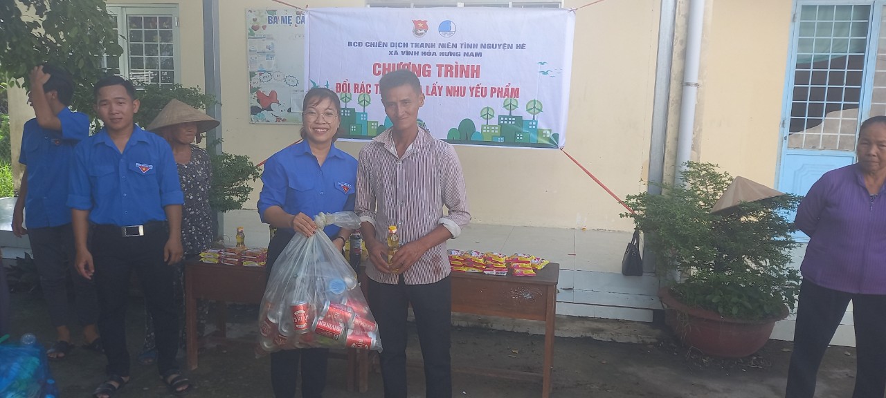 Tại buổi ra quân Ban chỉ đạo chiến dịch tình nguyện hè xã Vĩnh Hòa Hưng Nam đã triển khai các công trình, phần việc đổi rác thải nhựa lấy nhu yếu phẩm như đường, dầu ăn, nước tương…;